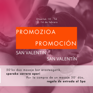Promocion San Valentin – Masaje Relax, Relajante 50´ duo + regalo de dos entradas spa de 2 h. 30′ mayor de 16 años